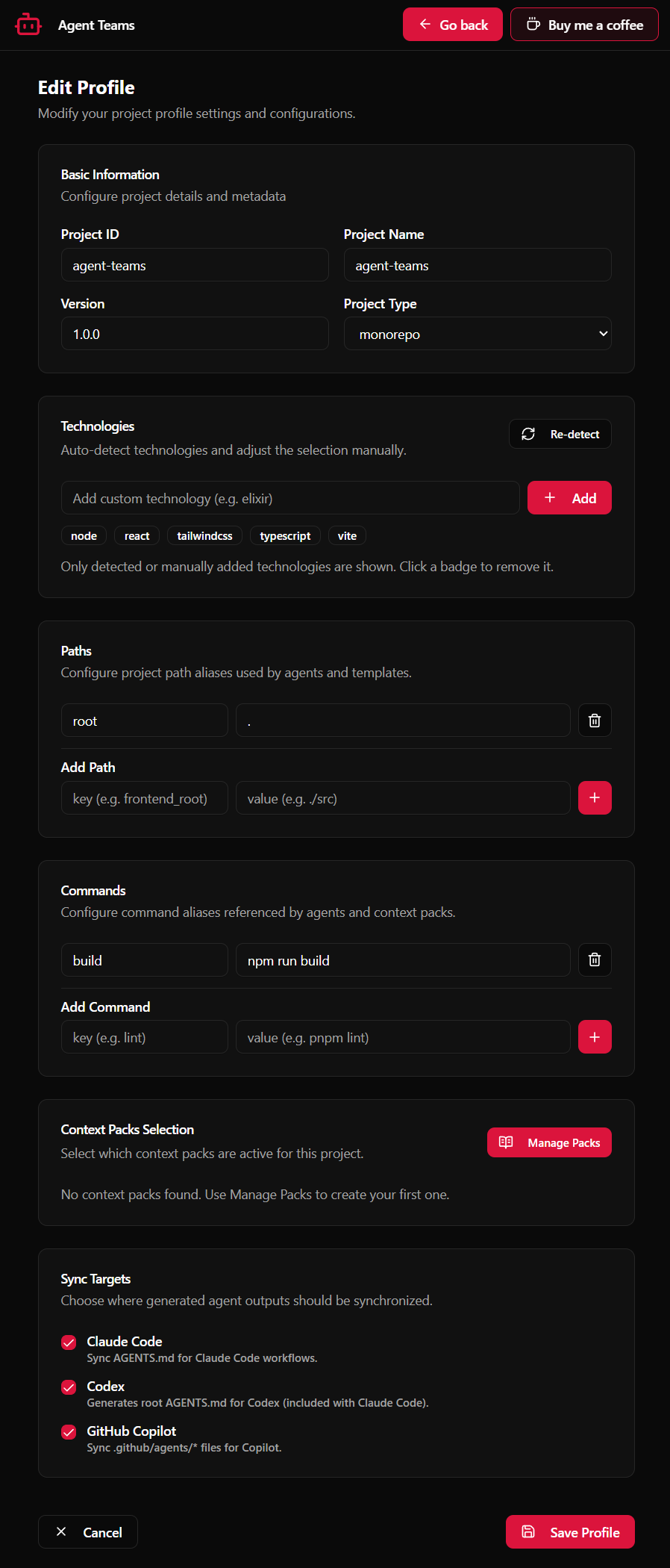 Click Save at the bottom of the editor. The profile is written to .agent-teams/project.profile.yml. Changes are picked up automatically on the next sync.